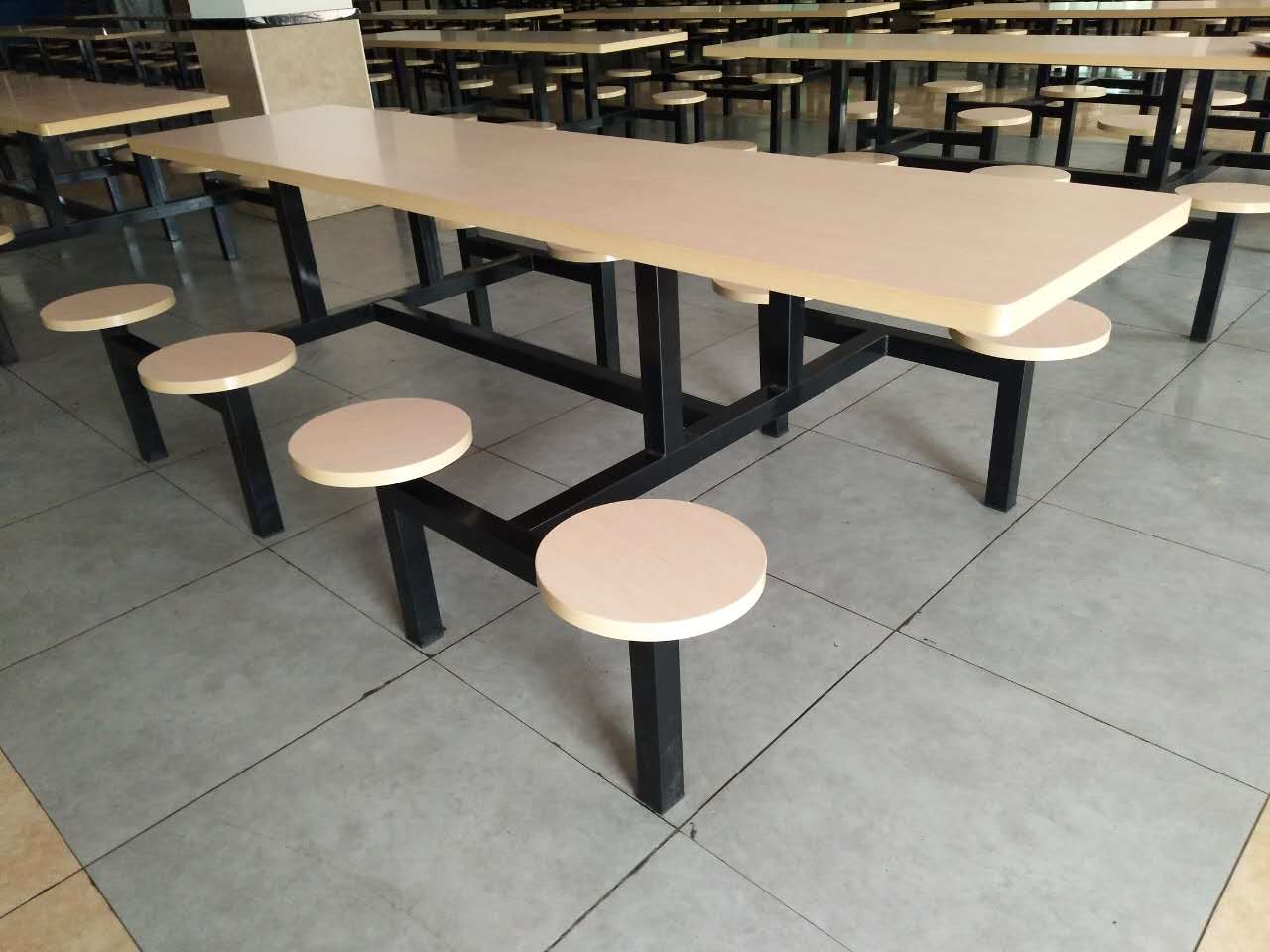 此餐桌桌面選用36mm厚優質多層生態餐用夾板,金橡木紋色餐廳專業防火板木皮高溫貼面制作,直徑300mm凳面選用25mm金橡木紋防水多層夾板制作,防火板木皮貼面。餐桌支架選用50*50加厚方管(1.2mm厚)制作。腳帶防水膠套。金屬支架塑膠粉為定制一級黑色環保粉末。管焊接表面要求波紋均勻,焊接處無夾渣、氣孔,并保證無脫焊、虛焊、焊穿等到現象。所有金屬作脫脂、除銹、酸洗、磷化、干燥等12道防銹工序處理后高溫靜電噴涂。無氣泡、無裂縫、表面光潔、靜電噴塑、烘干處理、高溫固化,表面無脫色現象,要求光滑無毛刺。使其美觀大方,牢固耐用,防水防油!品質保證!