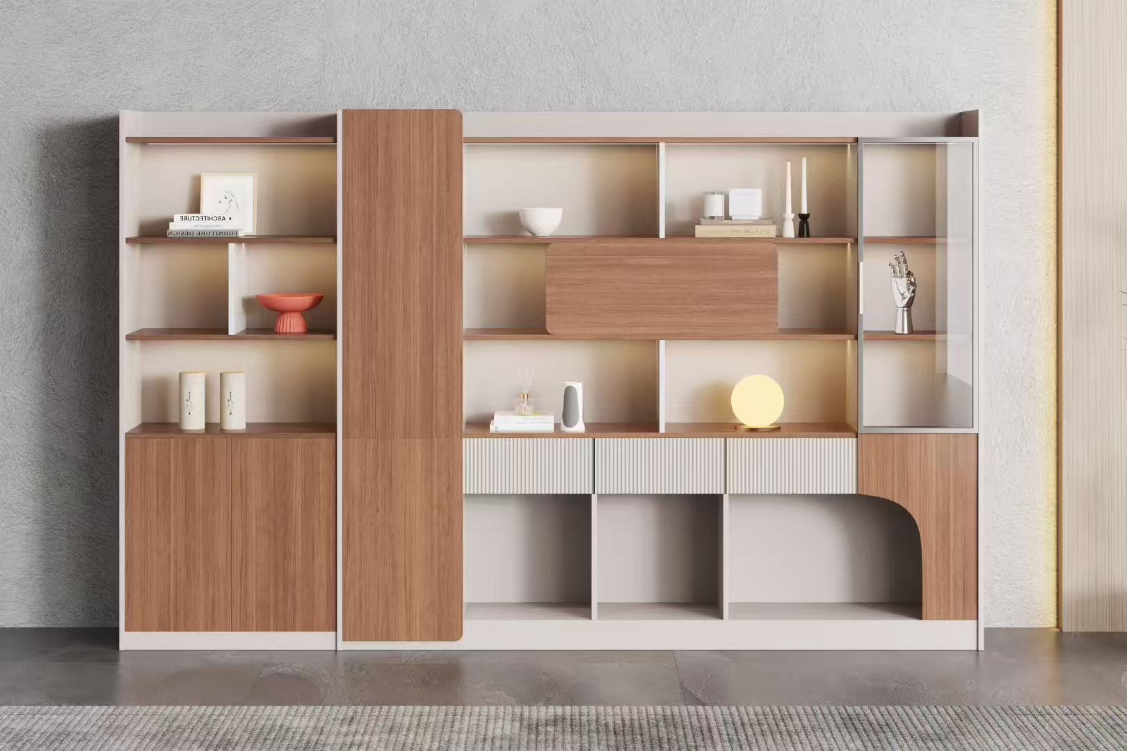 層次美學:開放式格架、封閉式柜體、玻璃展示區多元布局,既有「藏」的整潔,又有「露」的精致,書籍、擺件、藏品皆可找到專屬展示位;